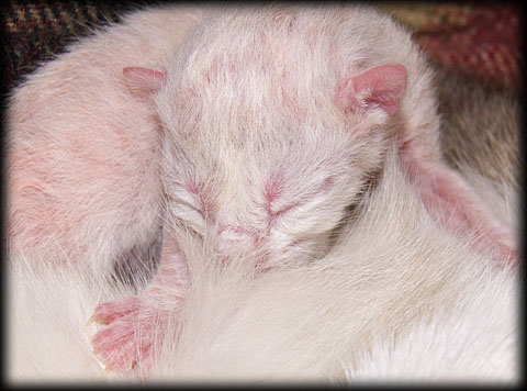 Après 4 jours les premieres touches de noir commencent à apparaitre, nez et oreille mais pas encore la queue |