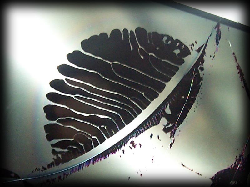 Vu par transparence la cassure se fond en une "coulée" de rouge bleu et noir.